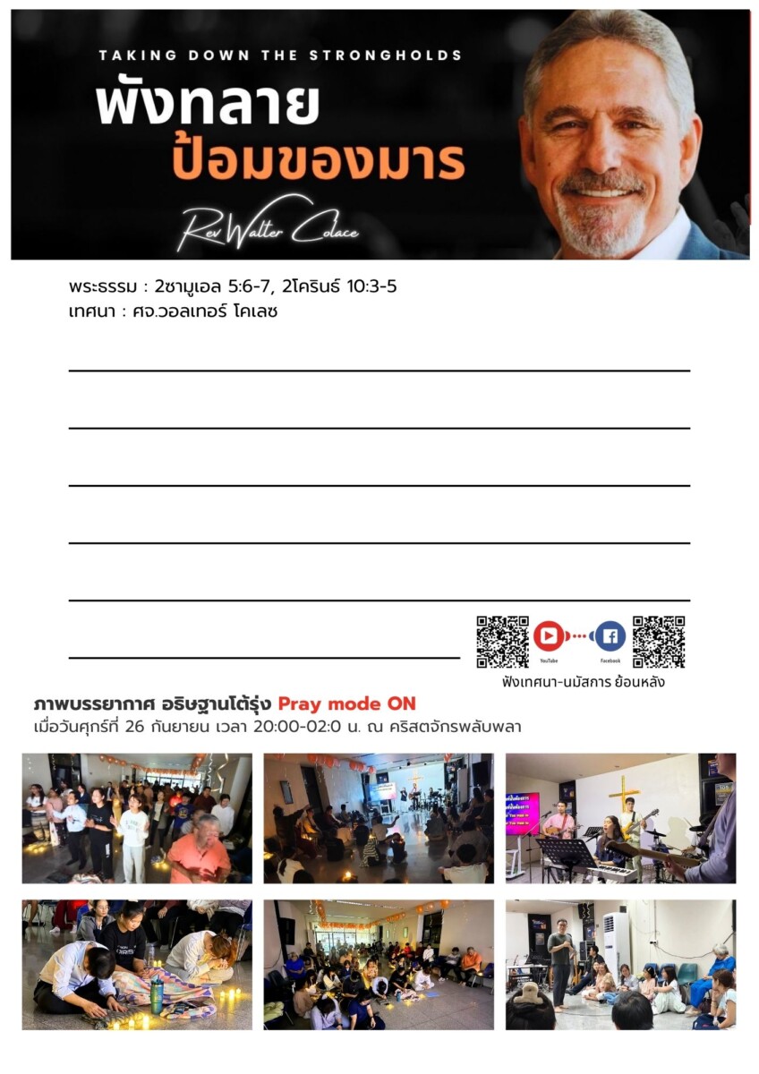 การทำลายป้อมของมาร หรือ “ป้อมปราการ” (Strongholds) เป็นประเด็นหลักที่ถูกเทศนา โดยเน้นย้ำว่าเป็นสงครามฝ่ายวิญญาณที่ต้องใช้ฤทธิ์อำนาจของพระเจ้าเพื่อเอาชนะ ซึ่งการเอาชนะป้อมปราการเหล่านี้จะนำไปสู่การปลดปล่อยและชีวิตใหม่ในพระคริสต์