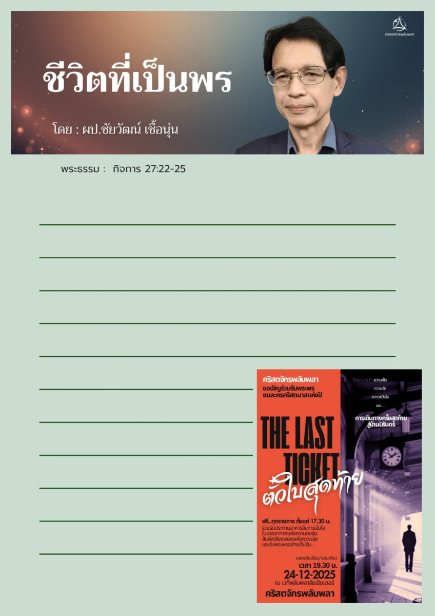 “ชีวิตที่เป็นพร” เรื่องราวการเดินทางทางเรือของอัครทูตเปาโลที่ต้องเผชิญกับพายุรุนแรงและการถูกคุกคามเพื่อเน้นย้ำถึงการพึ่งพาพระเจ้า ผู้เทศนาเริ่มต้นด้วยการเน้นย้ำความสำคัญของการอธิษฐานขอพร และกล่าวถึงเหตุการณ์ที่เปาโลถูกจับกุมและเดินทางไปยังกรุงโรม ซึ่งระหว่างทางมีคำเตือนเรื่องอันตรายจากการเดินทางทางเรือแต่กัปตันและเจ้าของเรือไม่เชื่อ โดยผู้เทศนาใช้สถานการณ์นี้เปรียบเทียบกับการไม่เชื่อฟังคำเตือนที่มาจากพระเจ้าซึ่งส่งผลกระทบต่อผู้อื่น บทเทศนาชี้ให้เห็นว่าแม้ในสถานการณ์ที่สิ้นหวังเมื่อเรือแตกและลูกเรือหมดหวัง พระเจ้าย่อม พร้อมเป็นที่ลี้ภัยและเป็นกำลัง เสมอ และสุดท้ายเน้นย้ำถึงการที่พระเจ้าสามารถเปลี่ยนสถานการณ์พลิกผันให้เปาโลจากนักโทษกลายเป็นผู้ที่นำพระพร การรักษา และการปลดปล่อยมาสู่ผู้อื่น ซึ่งเป็นแบบอย่างของการ ใช้ชีวิตอย่างเป็นพรเพื่อผู้อื่น แม้ในความยากลำบากหรือการถูกเข้าใจผิด.